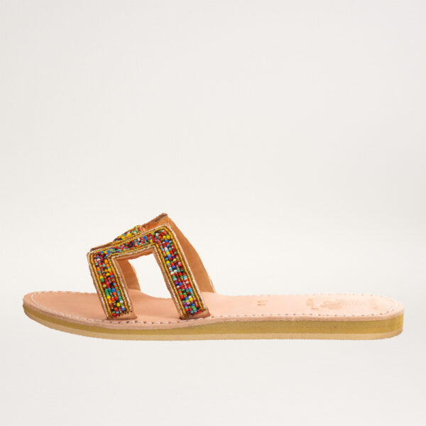 Infradito in pelle con ricami di perline. Un incontro tra il Mediterraneo e l’India.